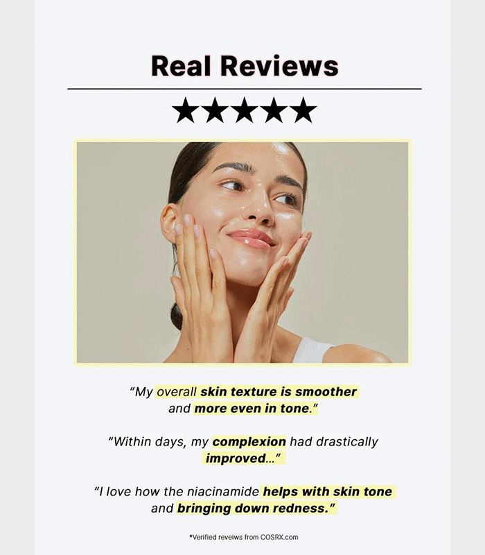 - Boosts Skin Brightness: The high concentration of Niacinamide (vitamin B3) in this serum helps enhance skin radiance over time.