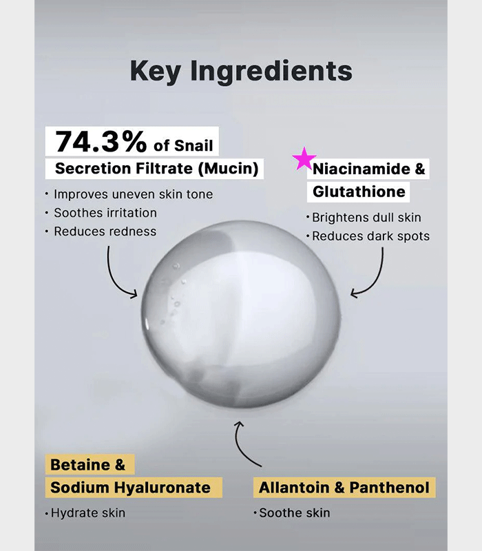 - It contains a 74.3% Triple Snail Complex, which includes snail secretion filtrate, black snail secretion filtrate, and gold snail secretion filtrate, along with 5% niacinamide and glutathione​ (COSRX Official)​.