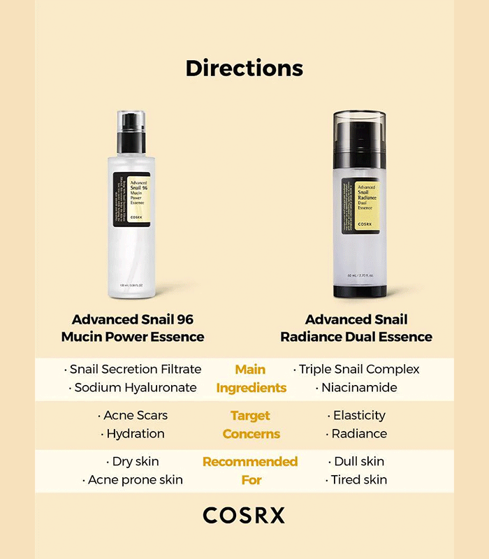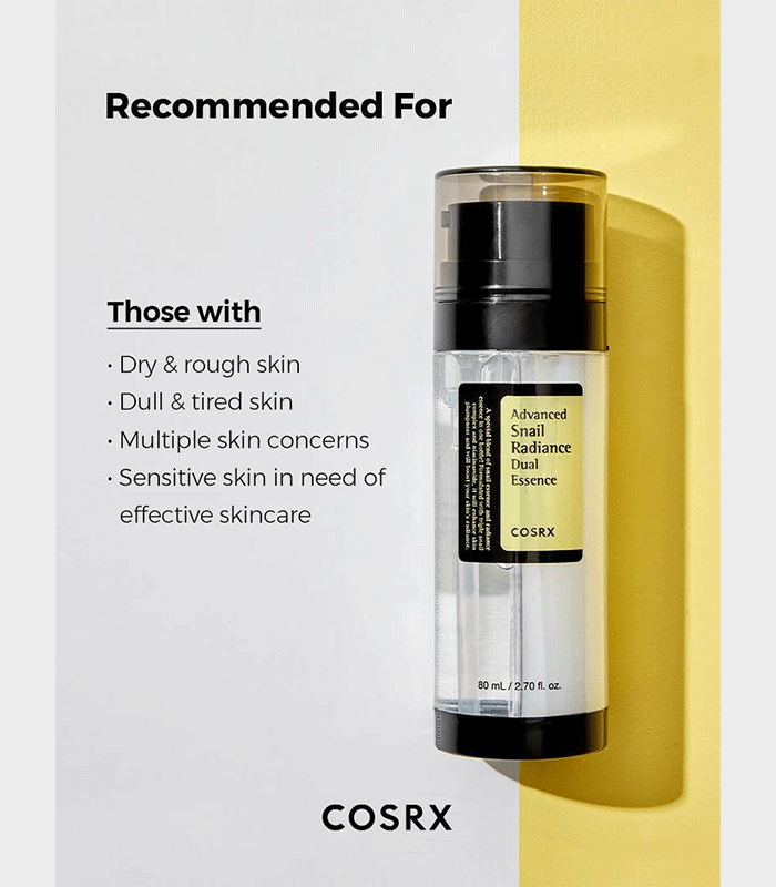 The COSRX Advanced Snail Radiance Dual Essence is formulated to target dry, rough, dull, and tired skin, making it suitable for various skin concerns​. The COSRX Advanced Snail Radiance Dual Essence hydrates, brightens, and plumps the skin, leaving a non-sticky, refreshing finish​. To use, pump an appropriate amount, mix the two essences, and apply gently on the face, tapping for better absorption​.
