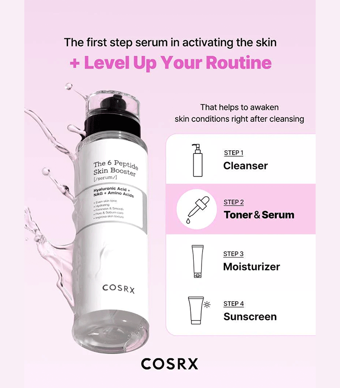 COSRX The 6 Peptide Skin Booster Serum is a skincare product designed to improve skin texture and firmness. It features six different peptides that work together to support skin elasticity and reduce the appearance of fine lines and wrinkles. This serum aims to provide hydration and promote a more youthful complexion by enhancing skin resilience and smoothness. It’s suitable for various skin types and can be used as part of a daily skincare routine to target signs of aging.