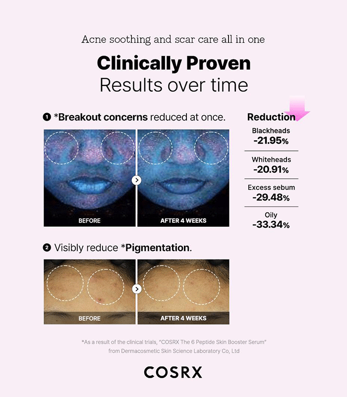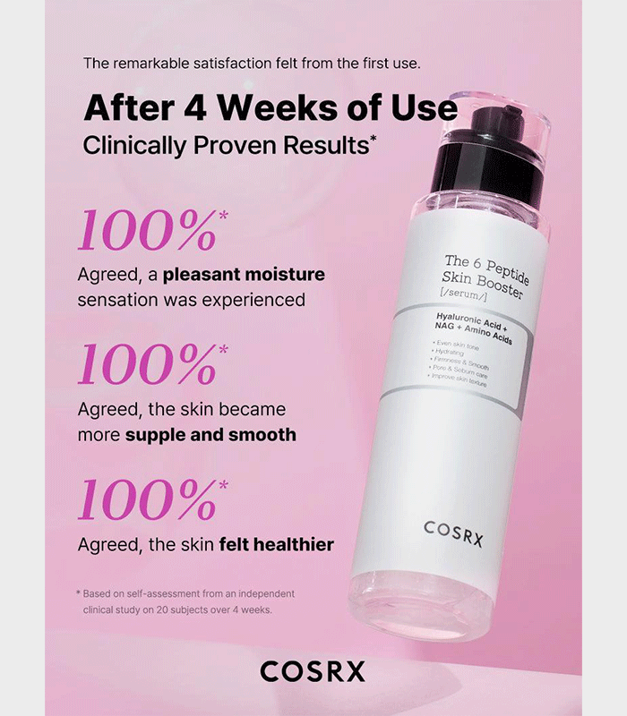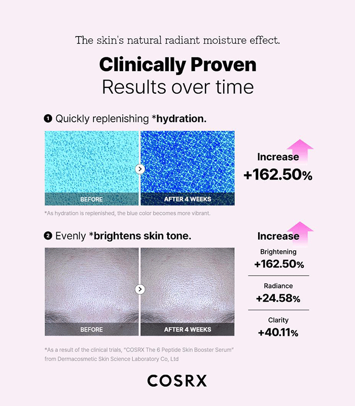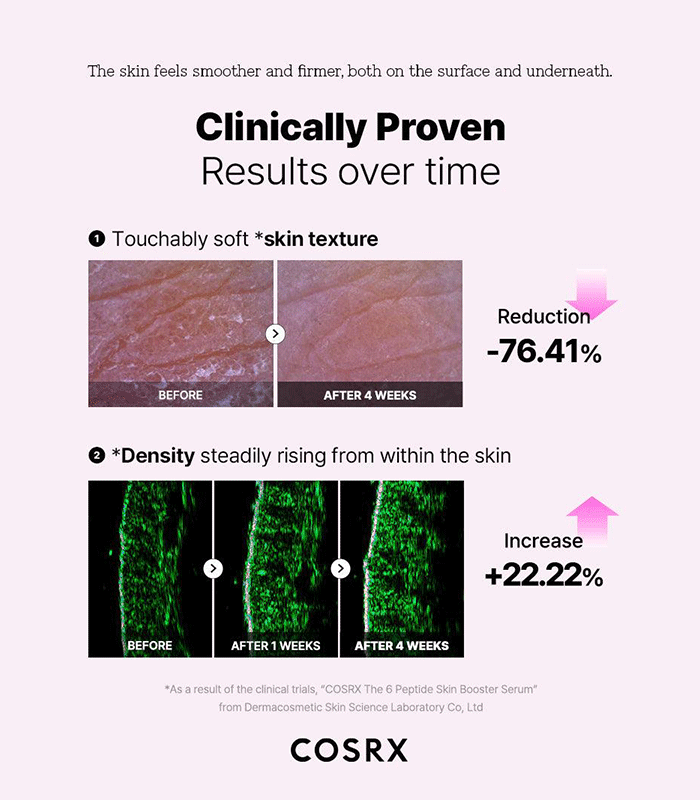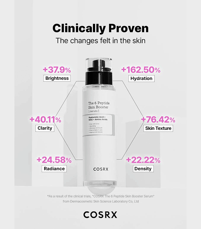 *Based on clinical trials of “COSRX The 6 Peptide Skin Booster Serum from Dermacosmetic Skin Science Laboratory Co.,Ltd