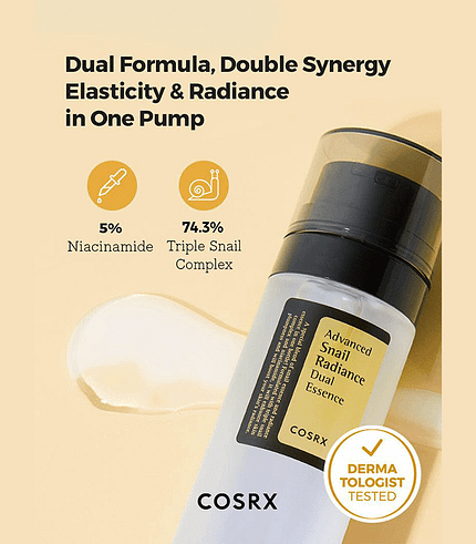 The COSRX Advanced Snail Radiance Dual Essence is a unique skincare product designed to enhance skin elasticity and radiance. The COSRX Advanced Snail Radiance Dual Essence features a dual-chamber design where high-efficacy snail essence and radiance essence mix upon pumping to deliver both plumping and brightening care in one application​ . Key ingredients include: